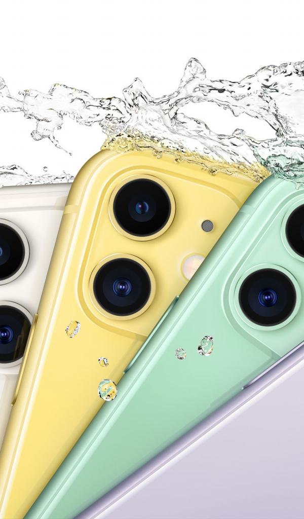 Обои Разноцветные iPhone 11 на белом фоне в каплях воды