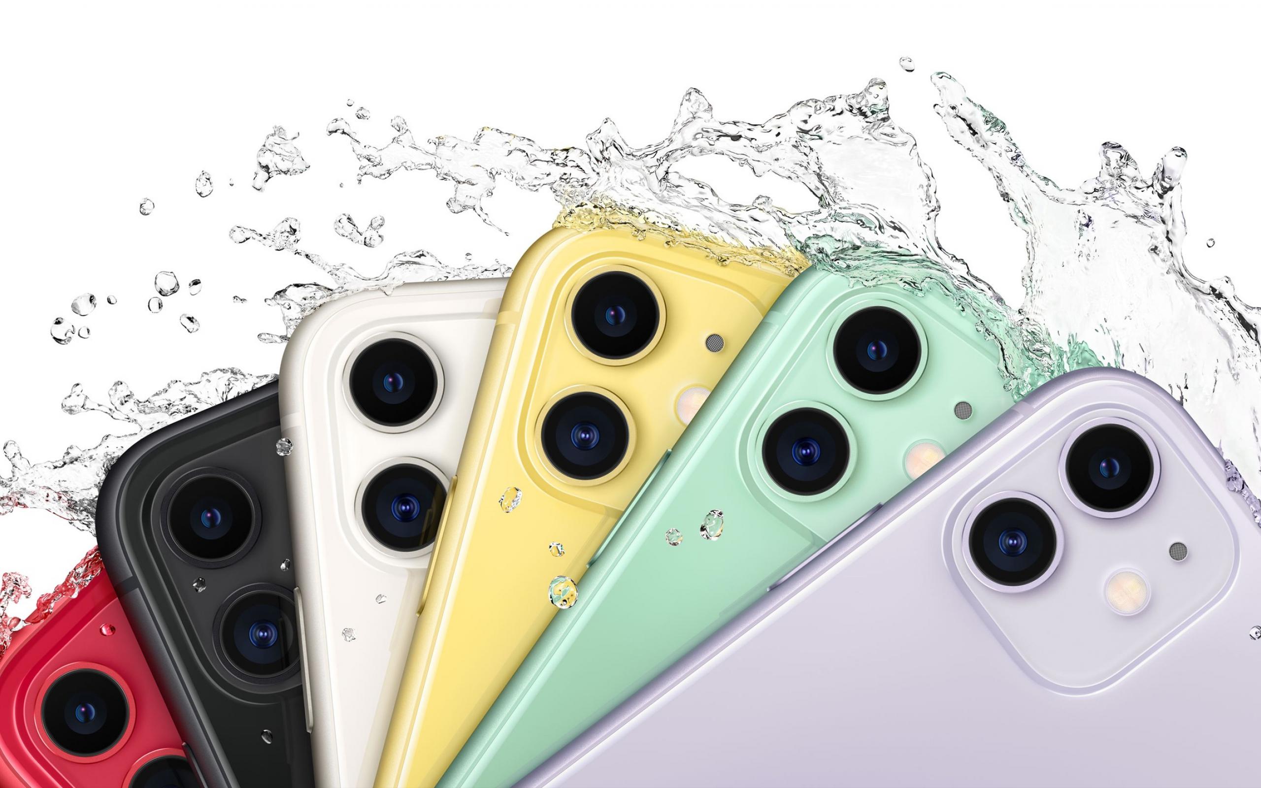 Обои Разноцветные iPhone 11 на белом фоне в каплях воды