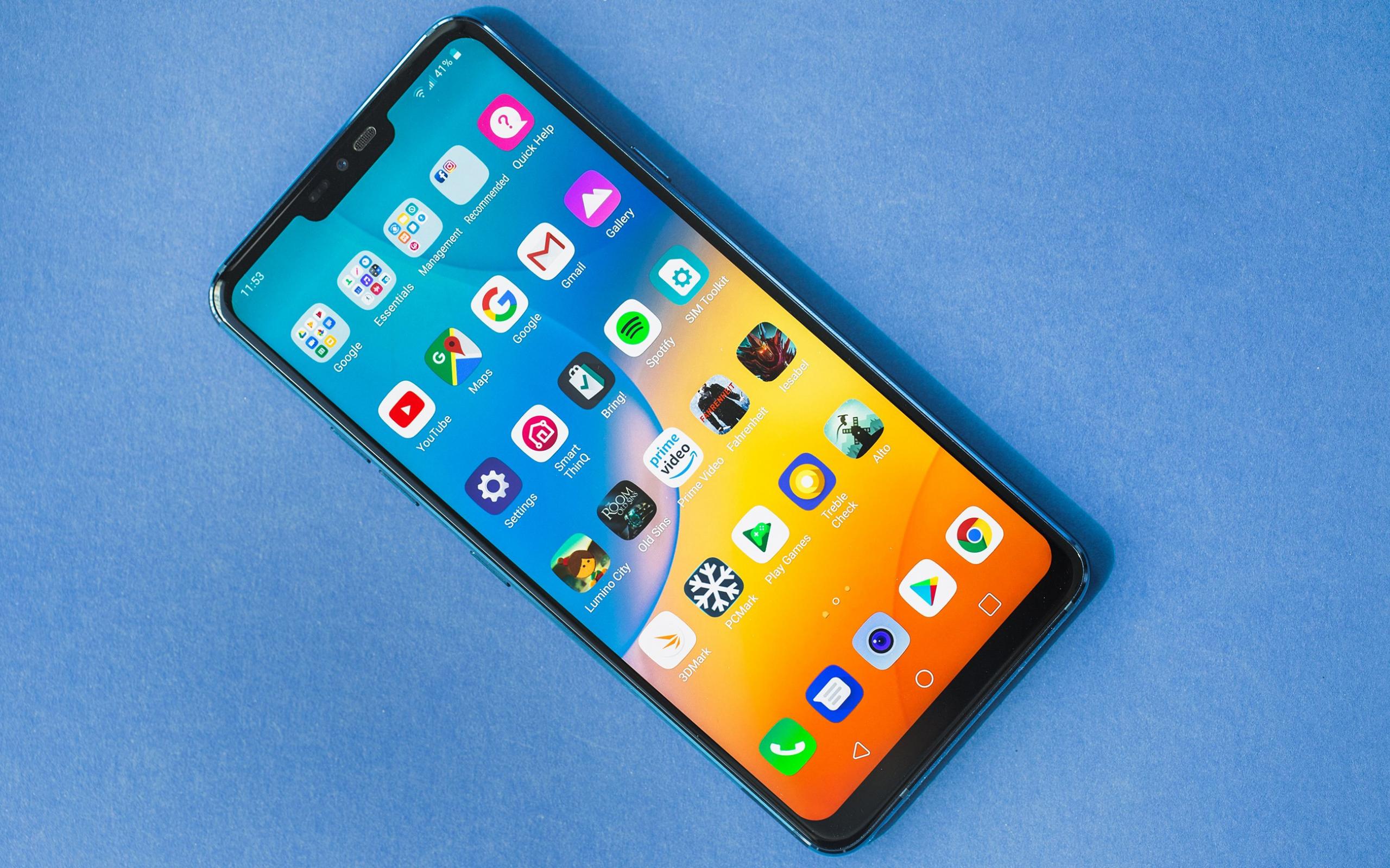 Обои Смартфон LG G7 ThinQ на голубом фоне