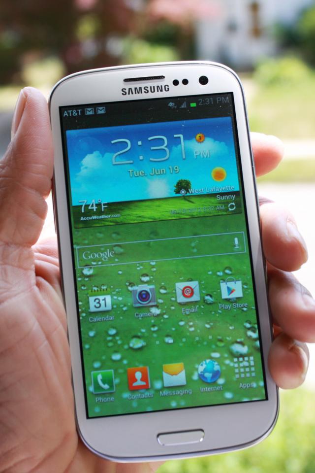 Обои Samsung Galaxy S3 в руке на белом фоне