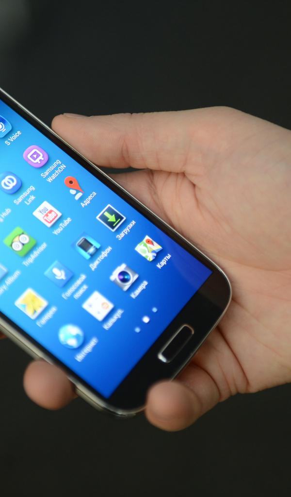 Обои Samsung Galaxy S4 в руке на сером фоне