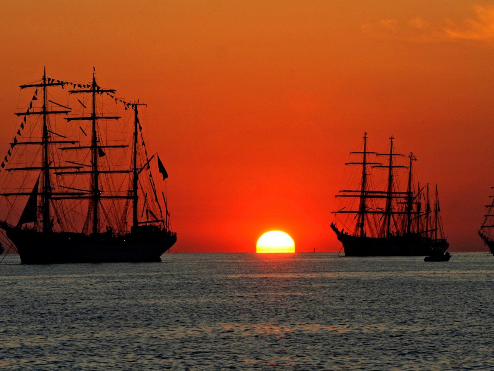 Обои Парусные корабли на фоне заката