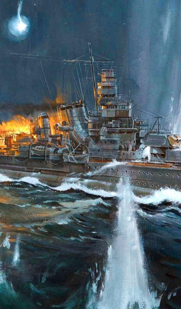 Обои Горящий корабль в фонтанах