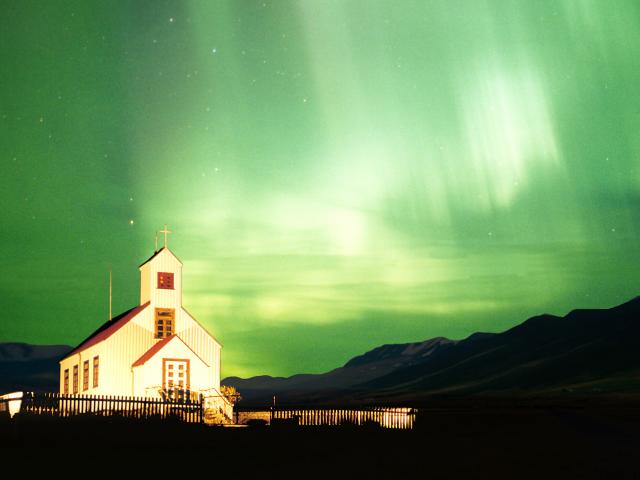 Обои Северное сияние над костелом