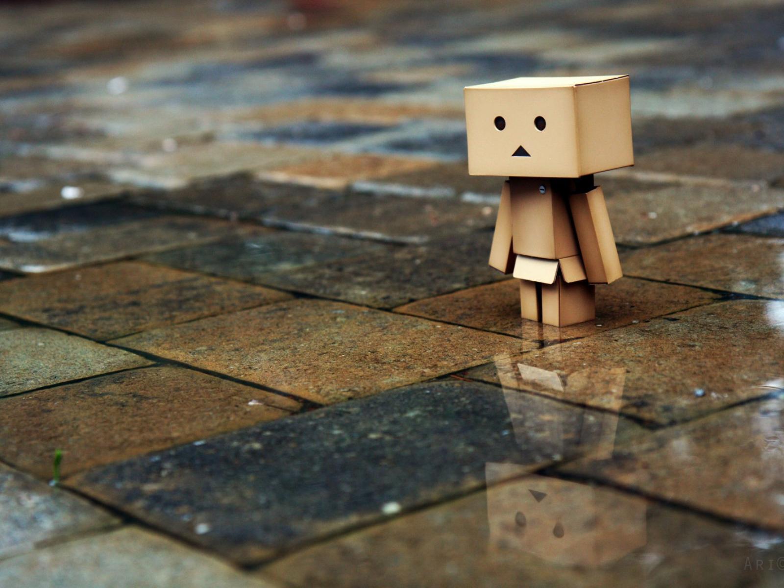 Обои Картонный человек на мокрой плитке