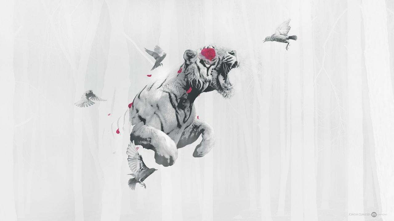 Обои Тигр летит среди птиц