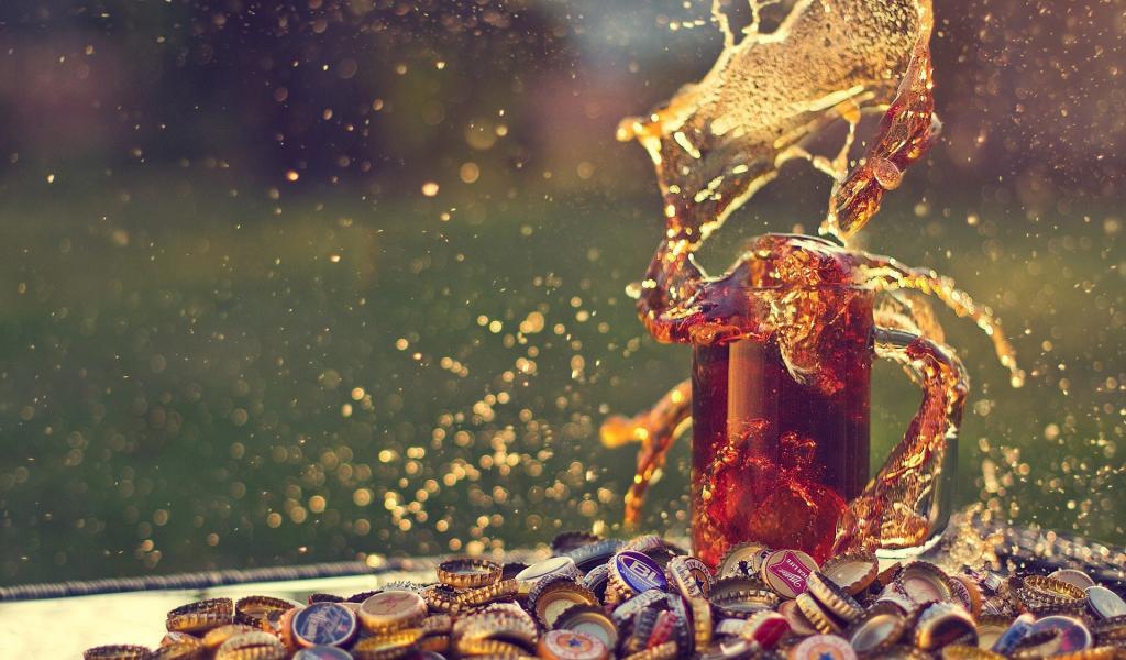 Обои Бокал пива среди горы крышек от пивных бутылок