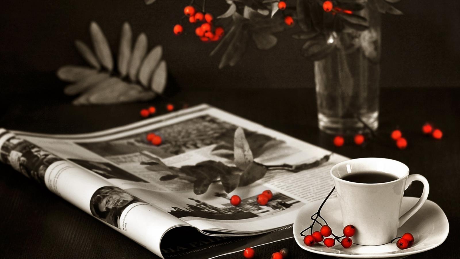 Обои Ягоды рябины на столе и журнале