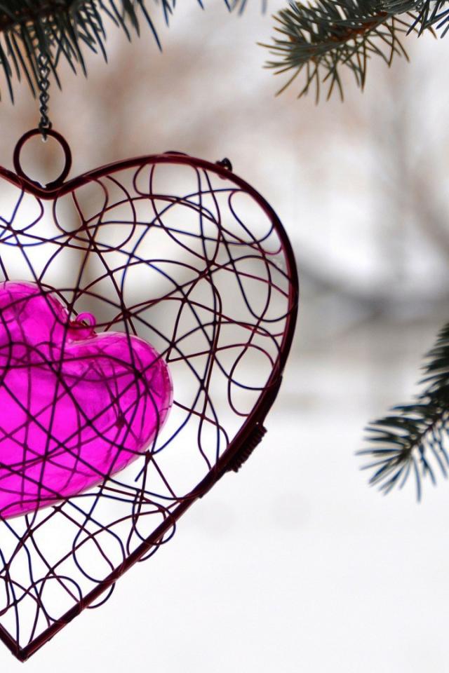 Обои Украшение в виде сердца висит на ветке ели