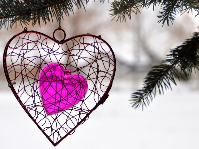Обои Украшение в виде сердца висит на ветке ели