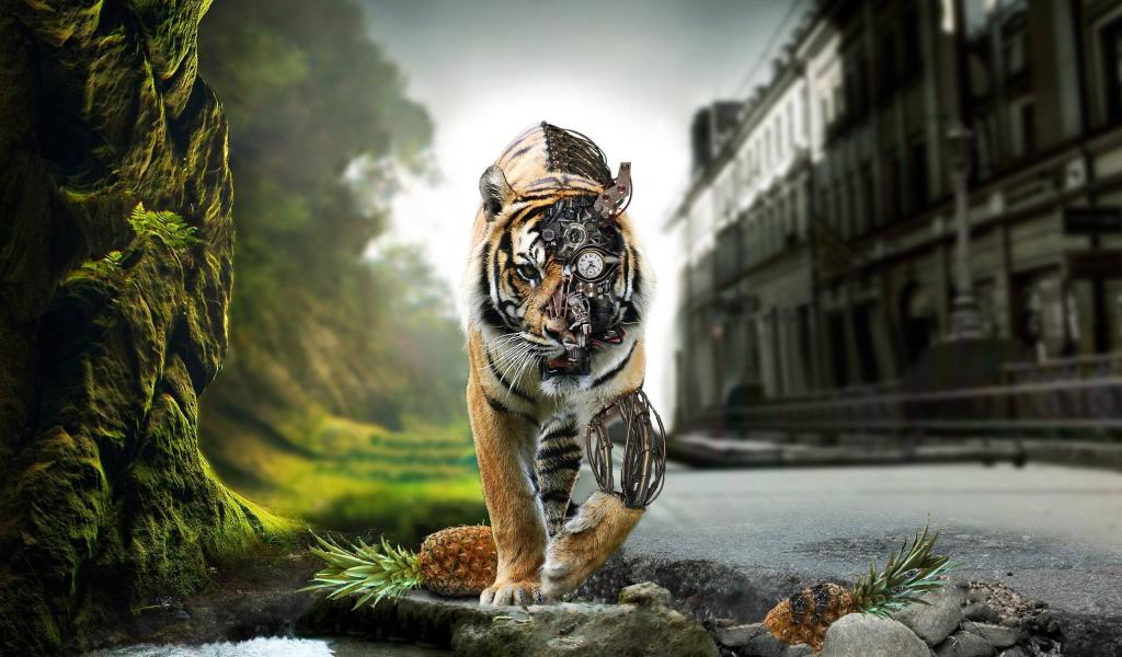 Обои Тигр на стыке природы и цивилизации, стимпанк