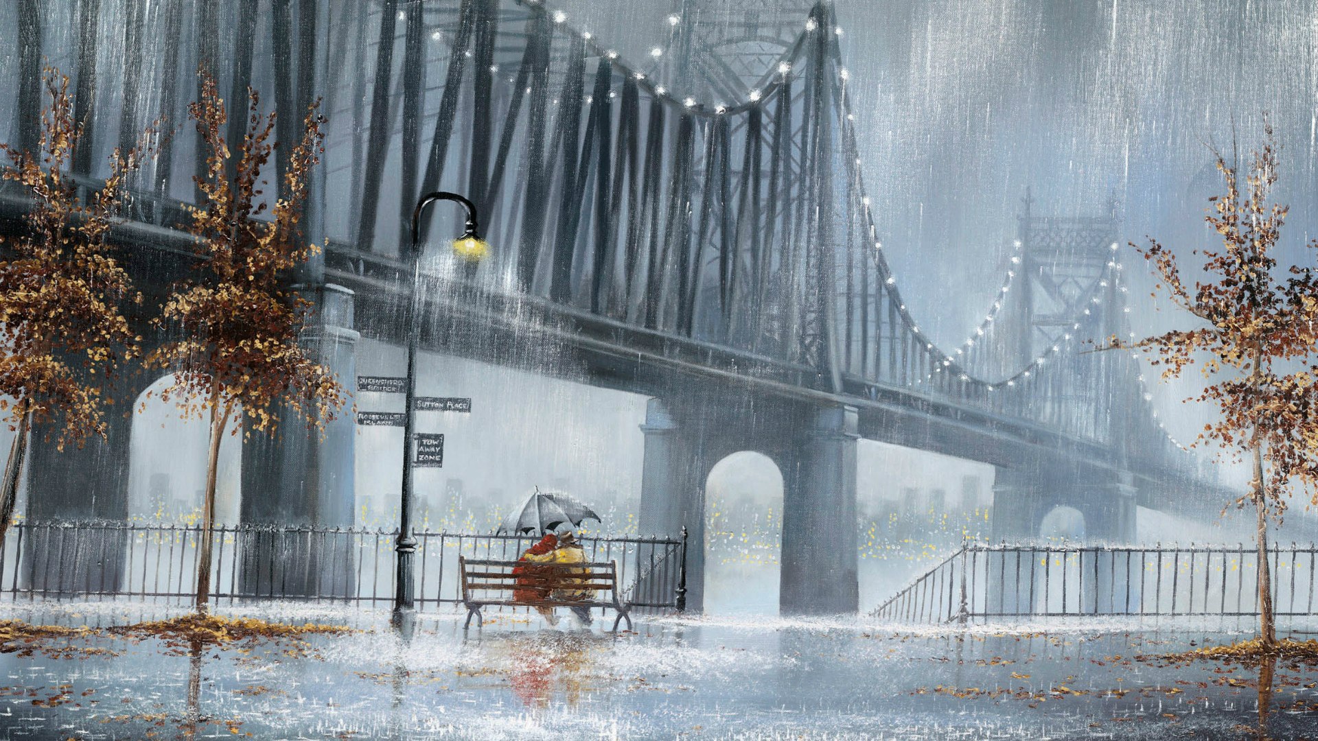 Обои Влюбленные у моста под дождем