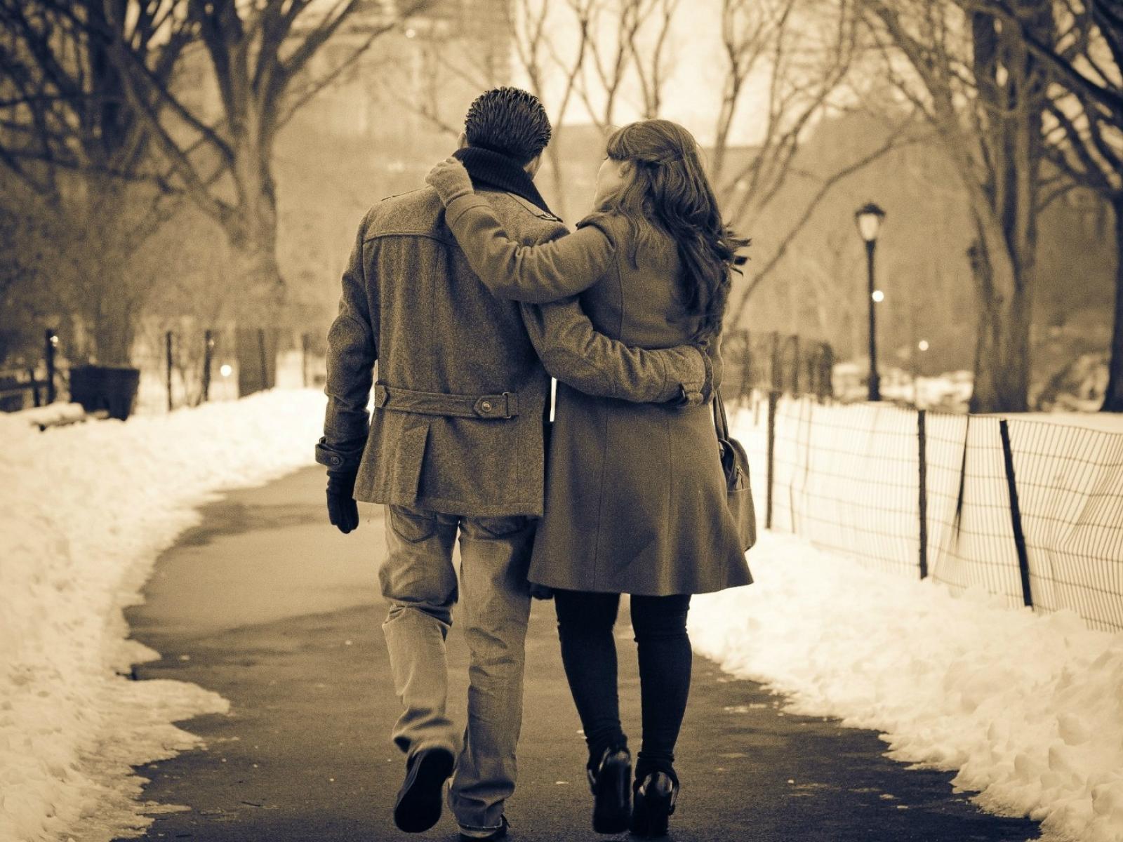 Обои Влюбленные гуляют по зимнему парку
