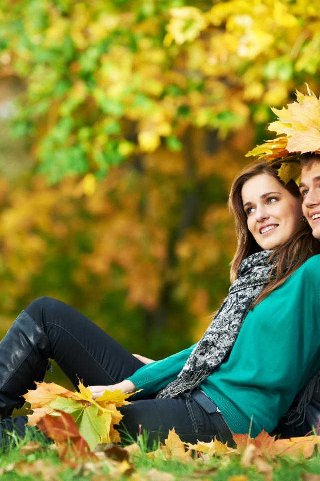 Обои Листья, Милая пара, Парень, Влюбленная девушка