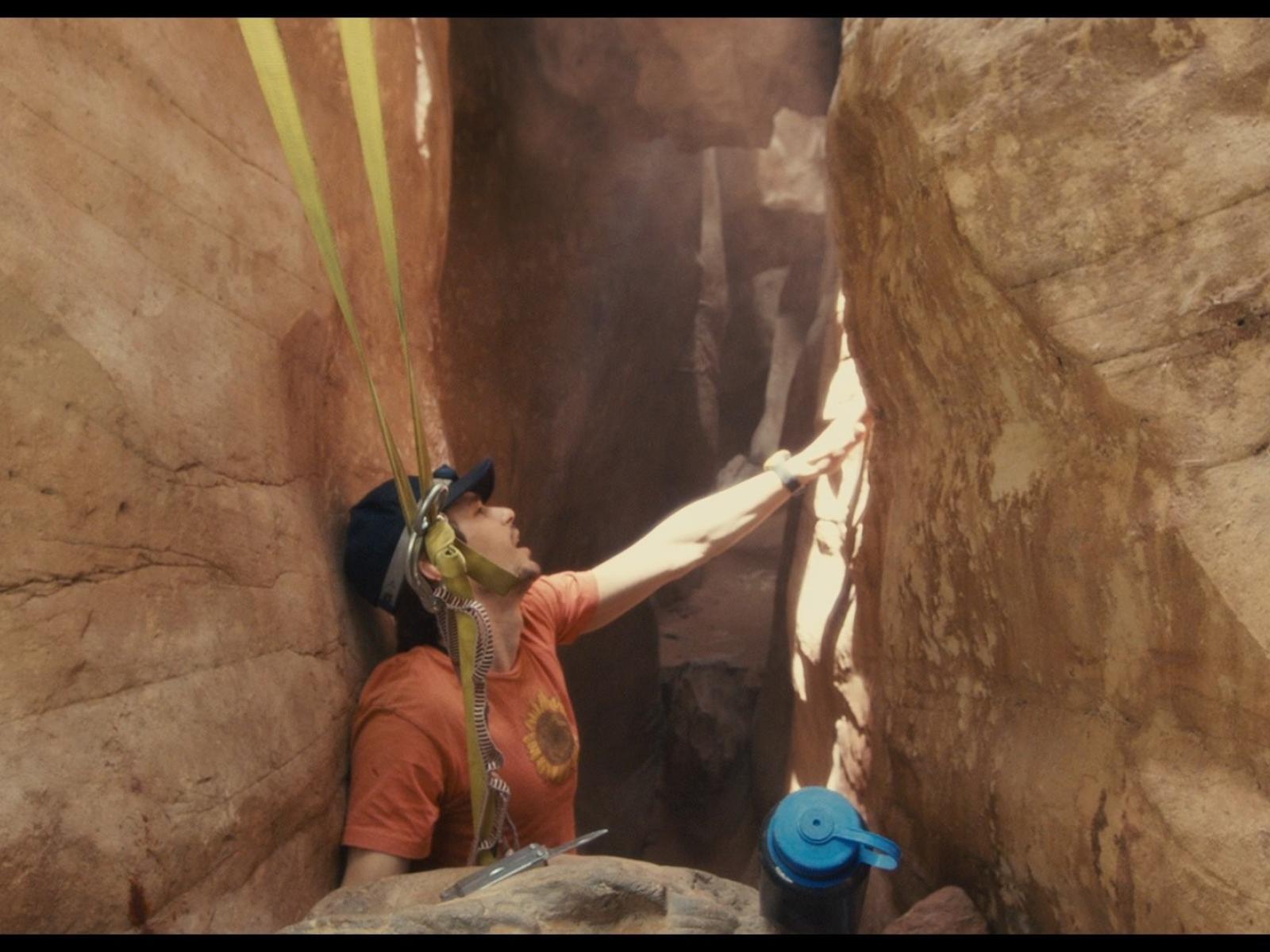 Обои Спелеолог зажат среди скал
