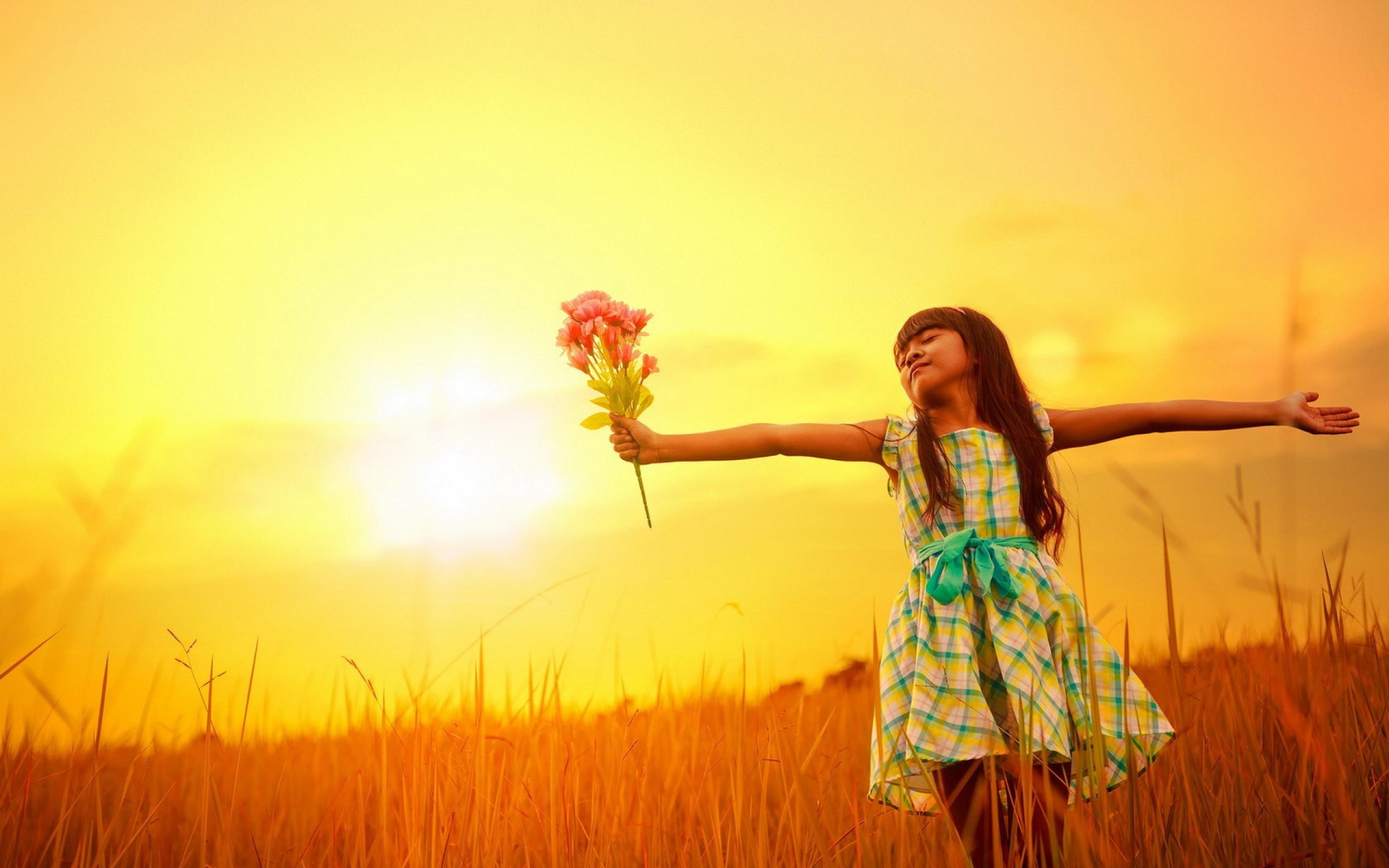 Обои Девочка с букетом стоит в поле