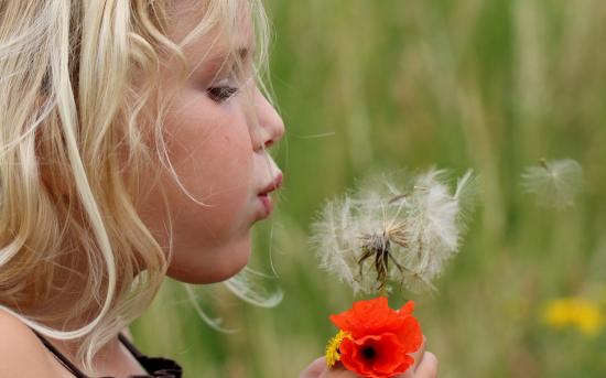 Обои Девочка дует на цветок одуванчик
