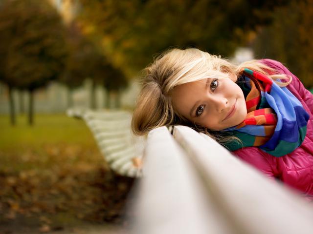 Обои Девочка, Скамейка, Взгляд, Парк