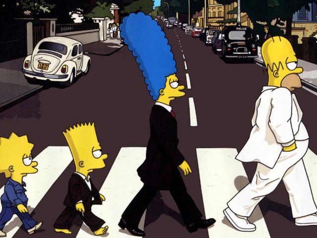 Обои Семья Симпсонов в костюмах переходит дорогу