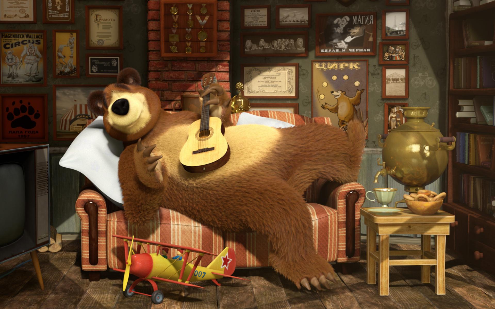 Обои Медведь играет на гитаре, мультфильм Маша и медведь