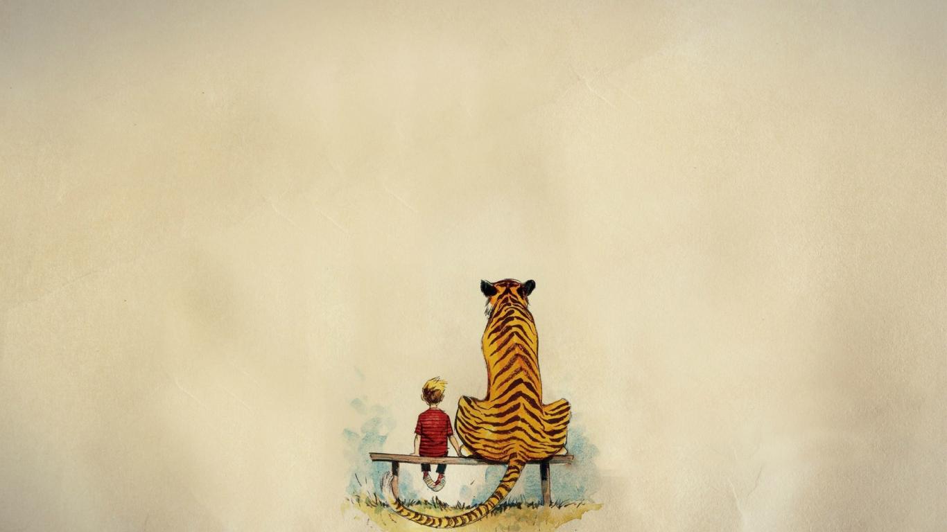 Обои Мальчик и тигр из комикса Кельвин и Хоббс
