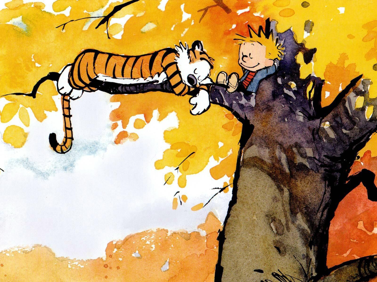 Обои Герои комикса Кельвин и Хоббс на дереве