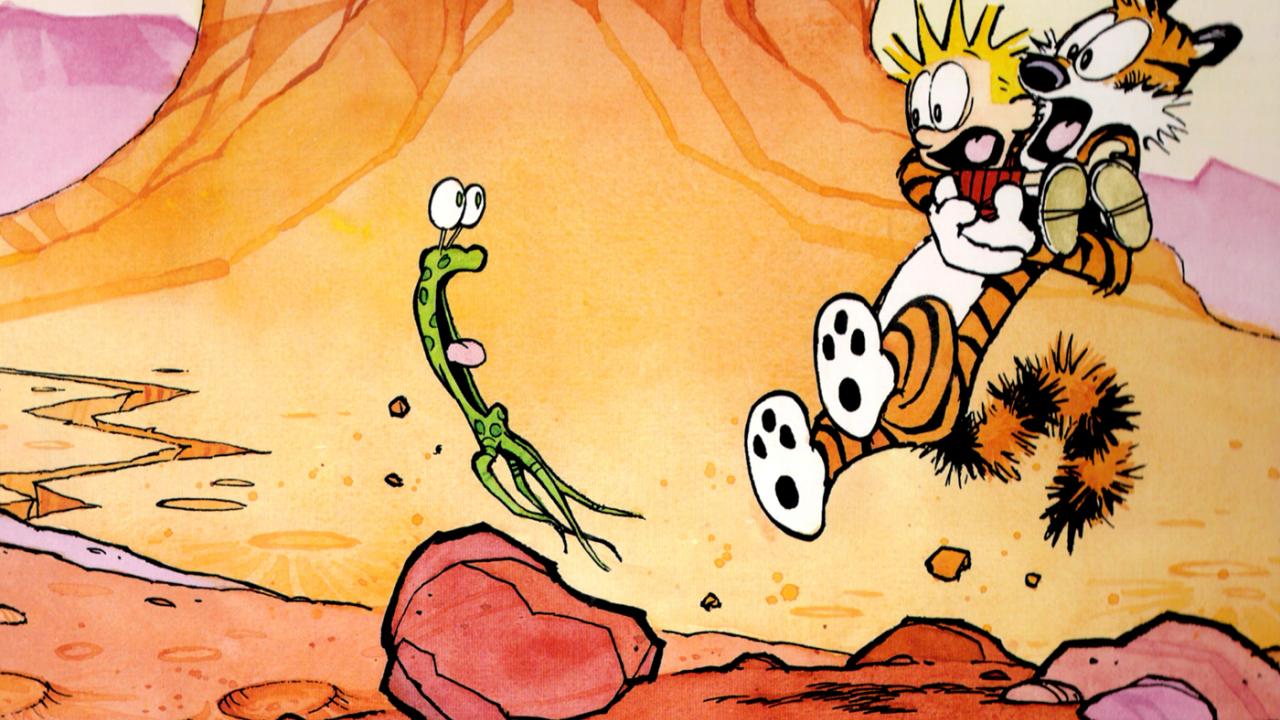 Обои Мальчик и тигр из комикса Кельвин и Хоббс