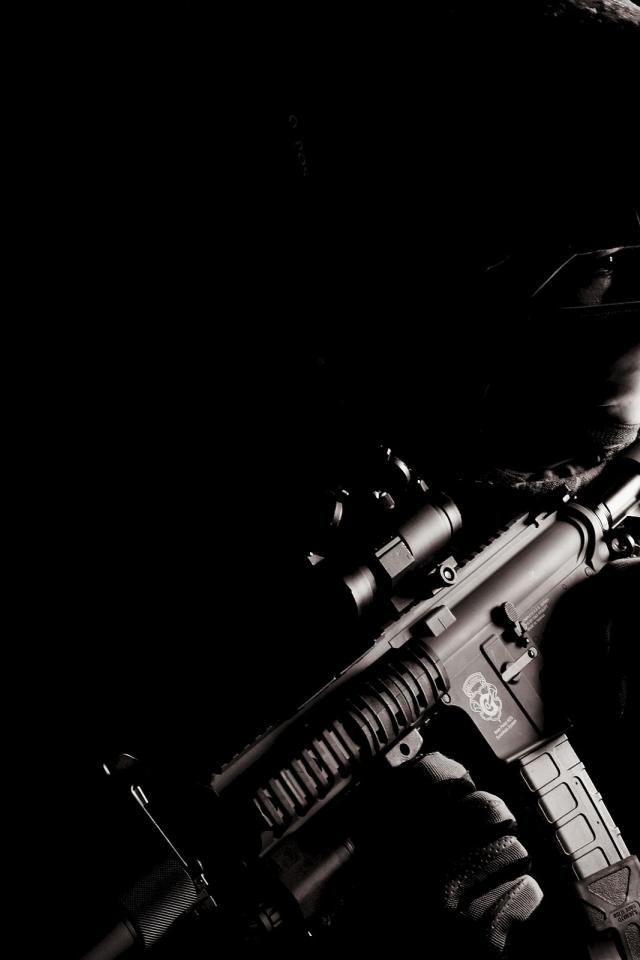 Обои Солдат с оружием на черном фоне