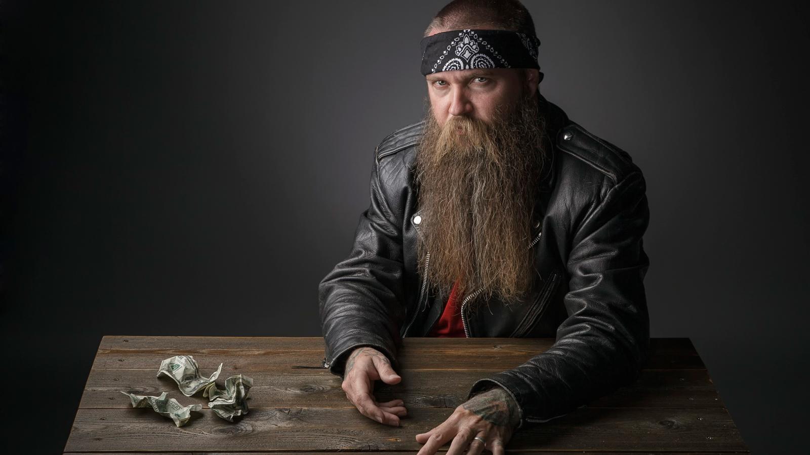 Обои Бородатый байкер за столом