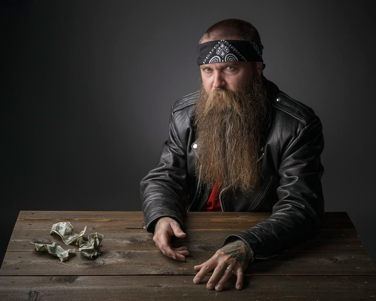 Обои Бородатый байкер за столом