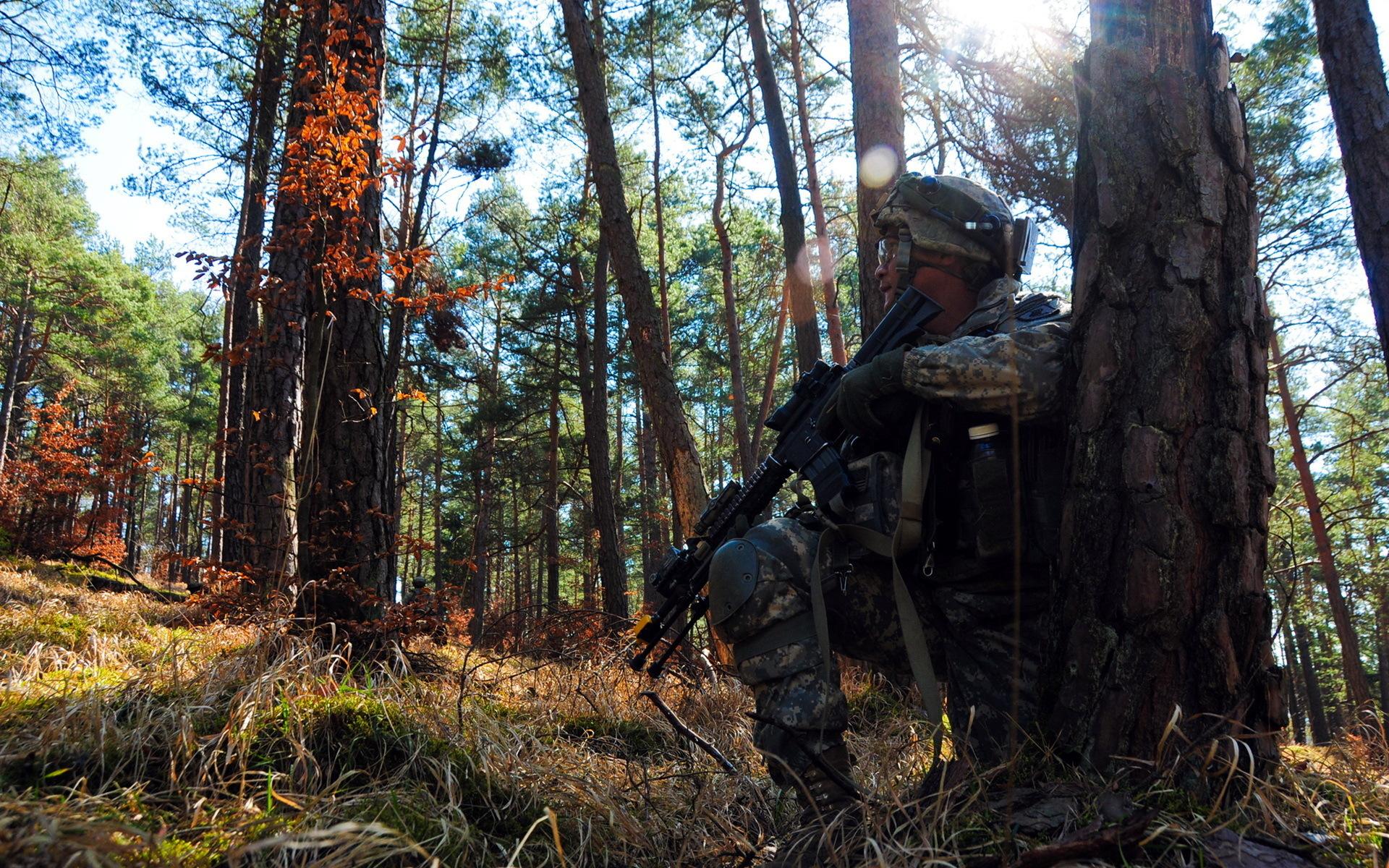 Обои Солдат прячется за деревом