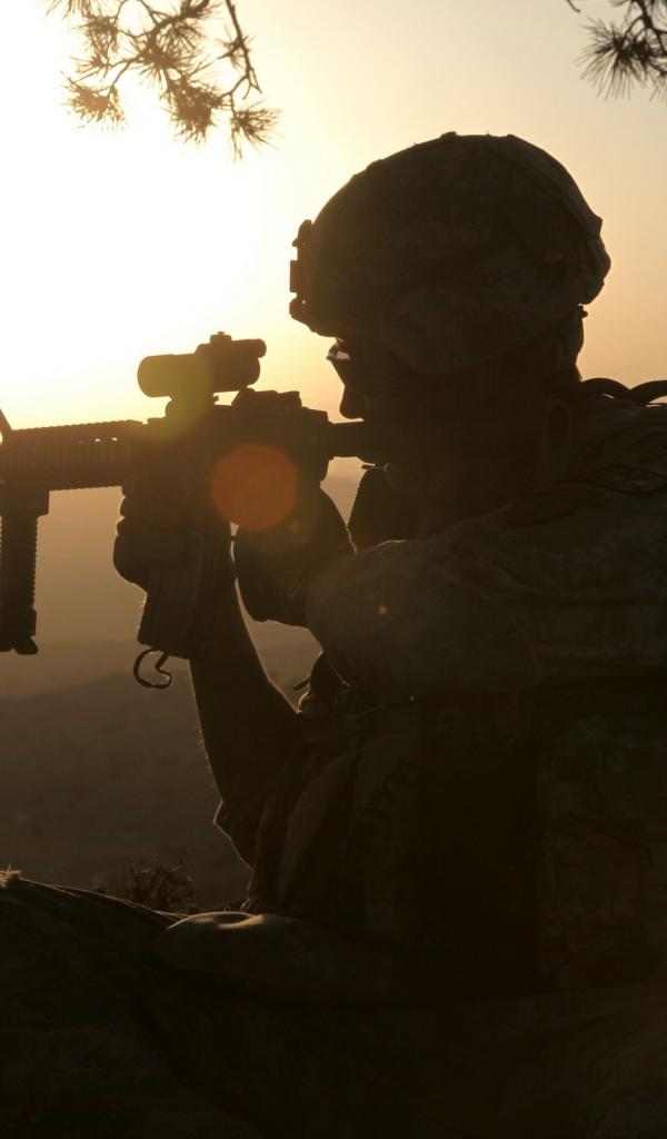 Обои Солдат с оружием на закате