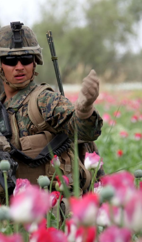 Обои Солдат в розовых тюльпанах