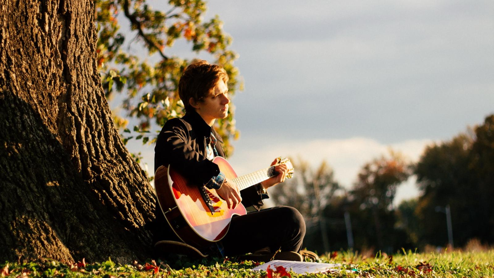 Обои Парень с гитарой у дерева