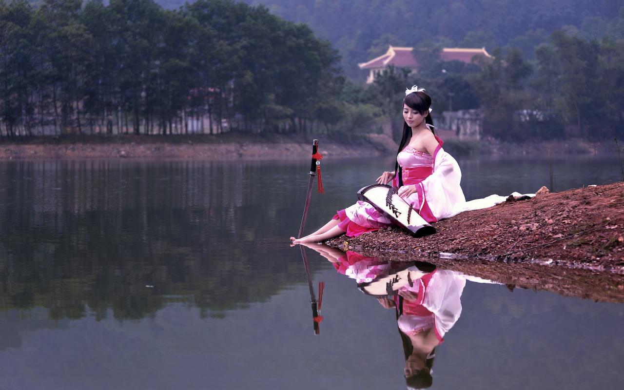 Обои Девушка на берегу озера