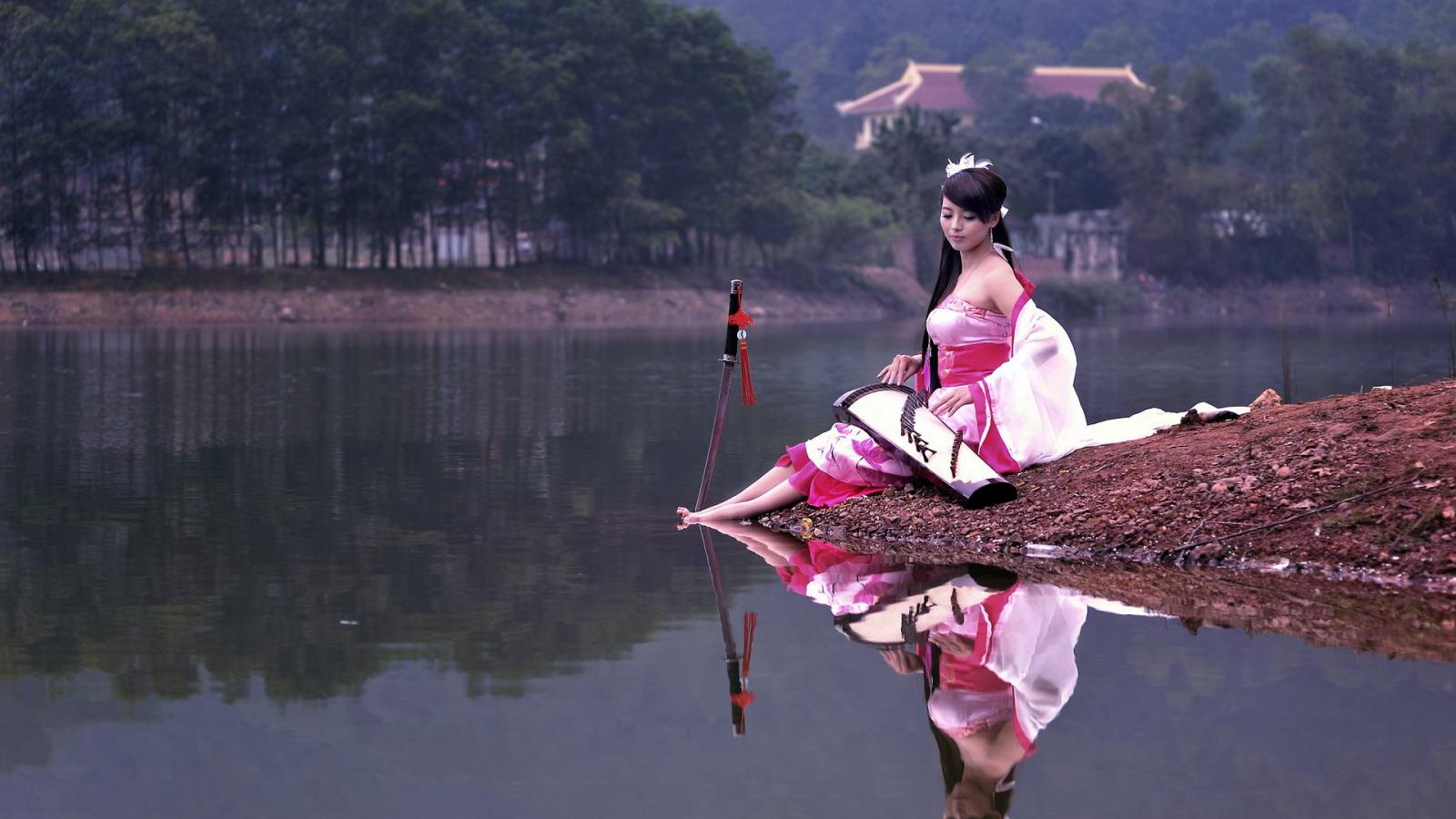 Обои Девушка на берегу озера