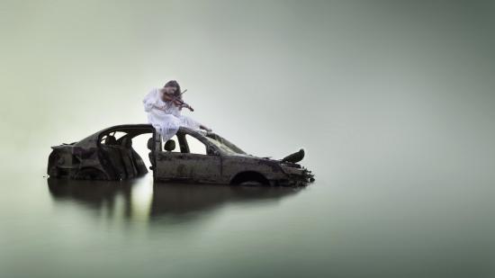 Обои Cкрипачка на затонувшем авто