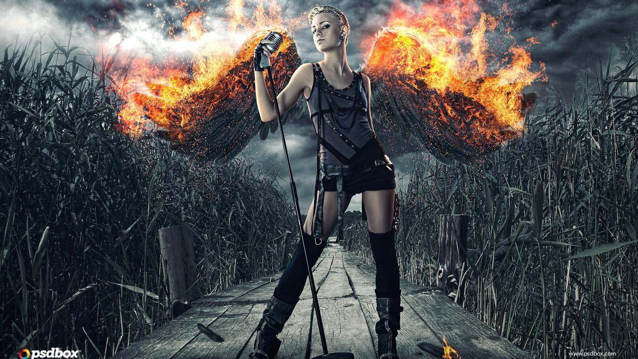 Обои Черный ангел с горящими крыльями