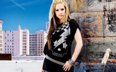 Обои Аврил Лавидж на диванчике с гитарой