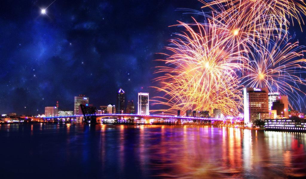 Обои Праздничный фейерверк над рекой
