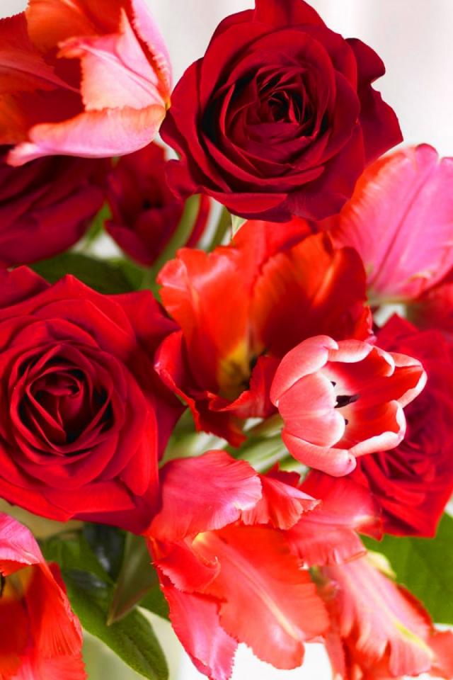 Обои Красные розы и красные тюльпаны в подарок на восьмое марта