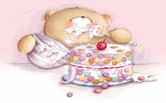 Обои Плюшевый медведь ест вкусный торт на день рождения