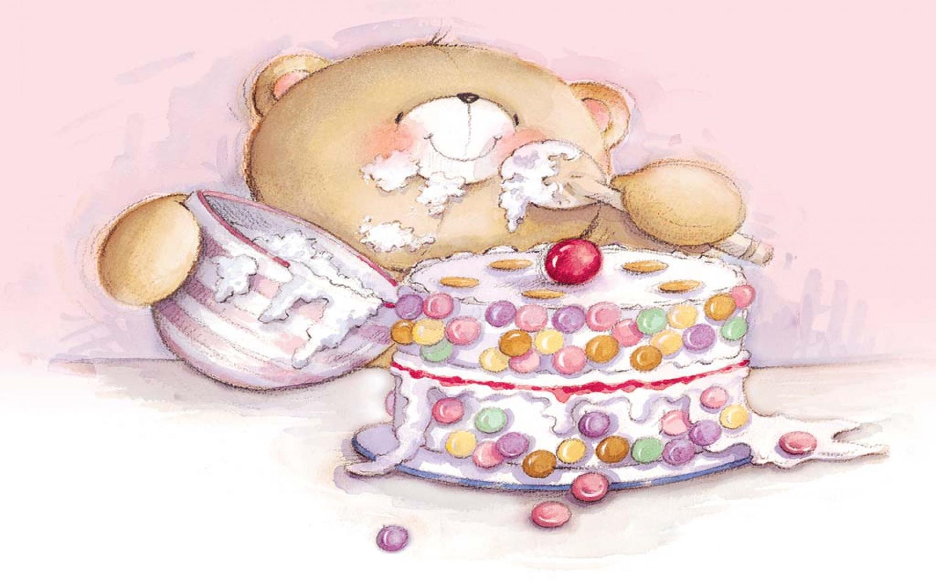 Обои Плюшевый медведь ест вкусный торт на день рождения