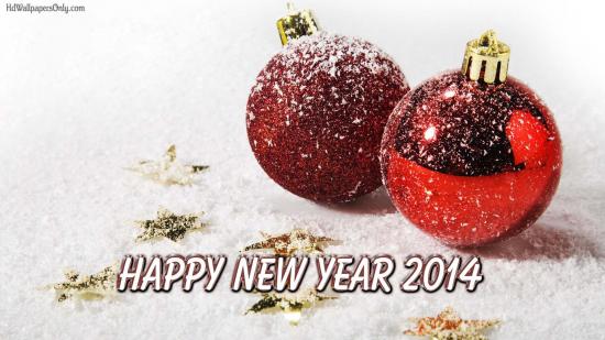 Обои Счастливого нового года 2014, заснеженные ёлочные игрушки