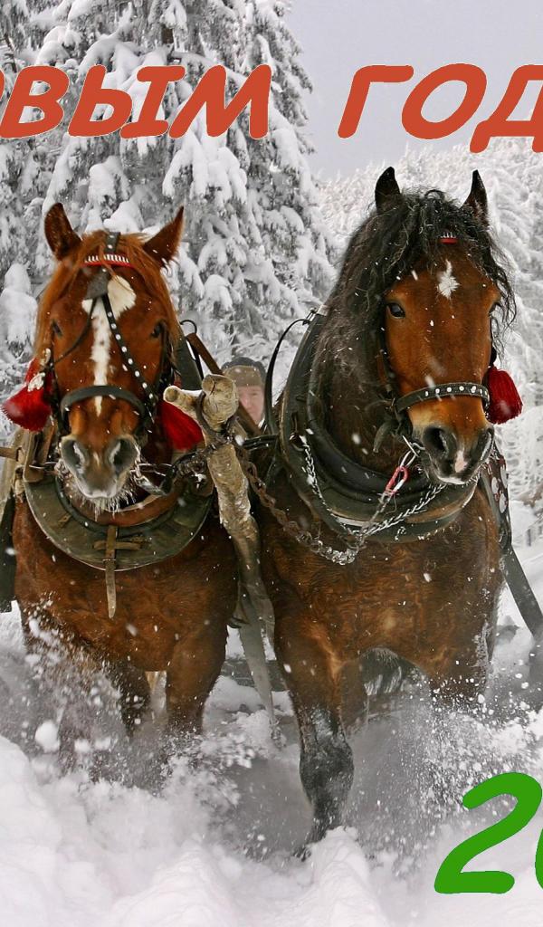 Обои С новым годом 2014, лошадки бегут по снегу