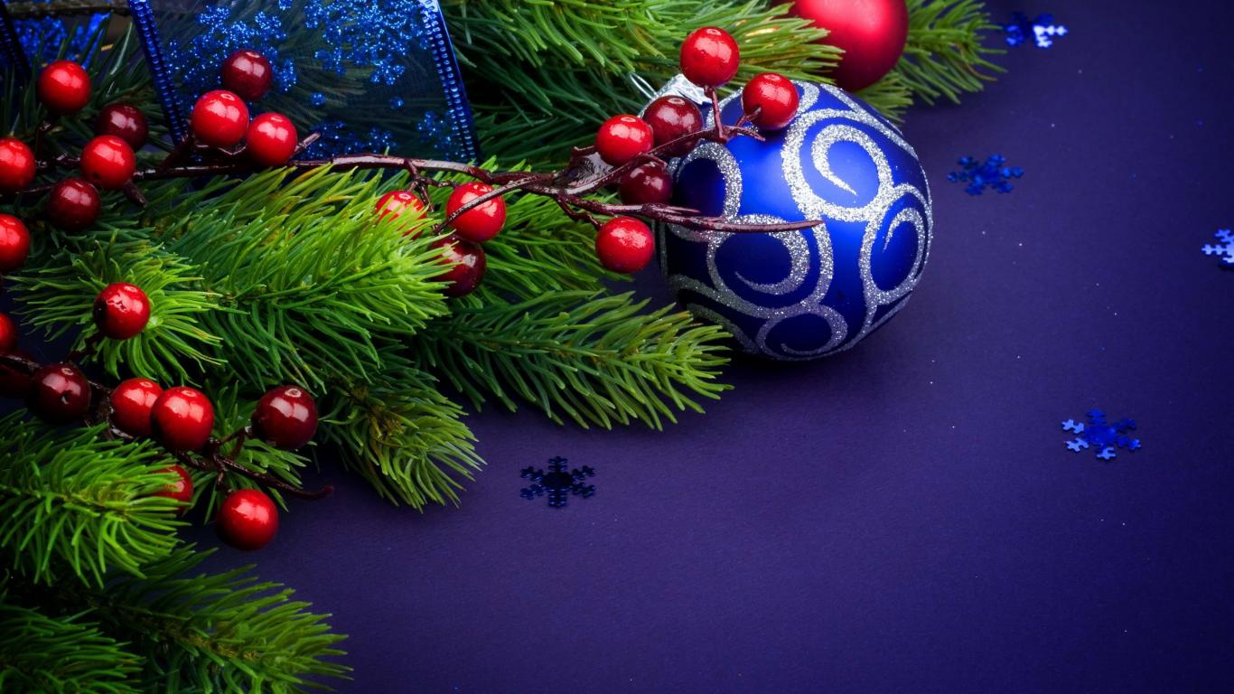 Обои Ёлочная ветка и синяя игрушка