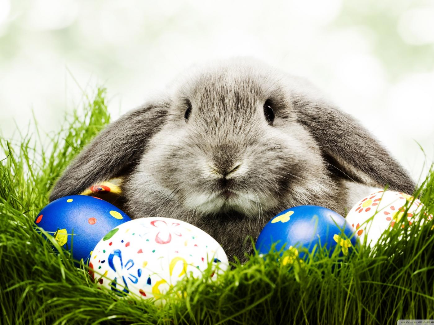 Обои Зеленая трава, Пасхальные яйца, Пасхальный кролик