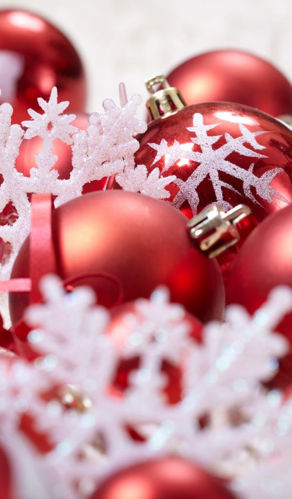 Обои Красные шары и белые снежинки