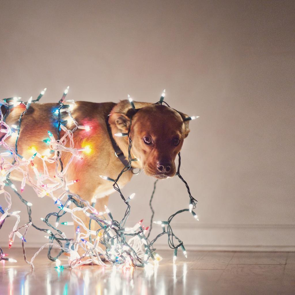 Обои Собака обвешенная гирляндами