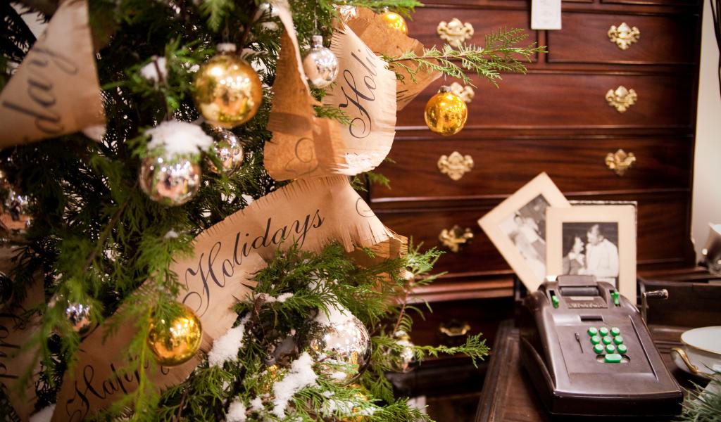 Обои Заснеженная ёлка в уютной комнате на рождество